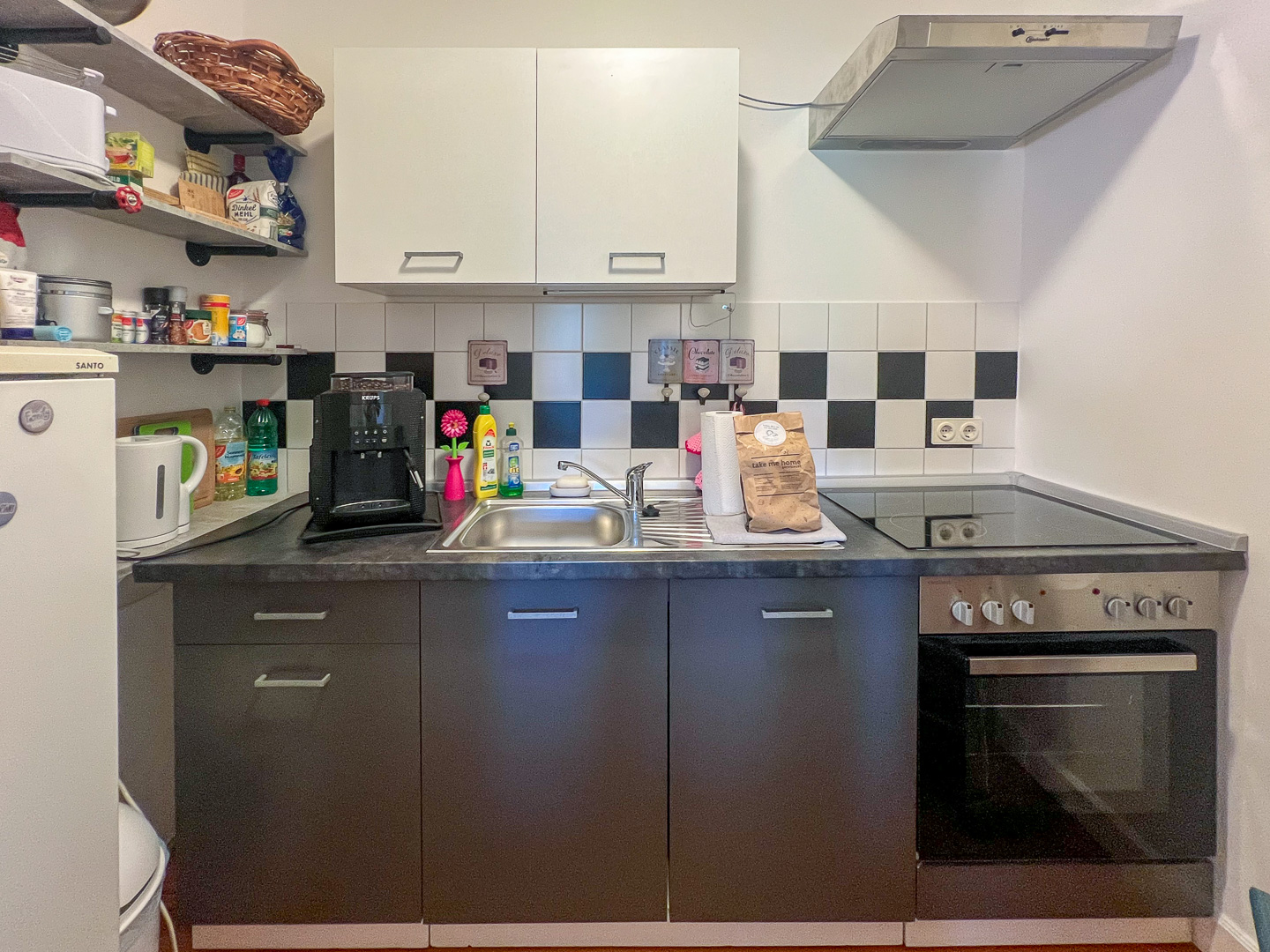 Kochuntensilien, Gefrierfach, Besteck, Kaffeemaschine, Herd, Geschirr, Küchenzeile, Geschirrspüler, Kühlschrank inkl. Gefrierfach, Backofen