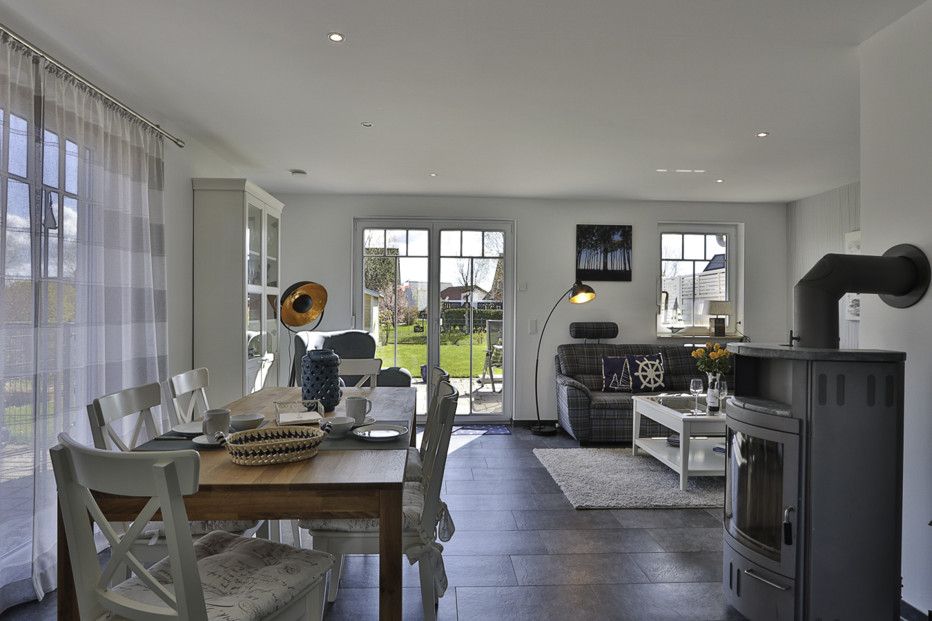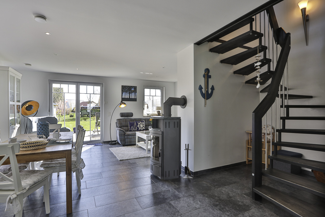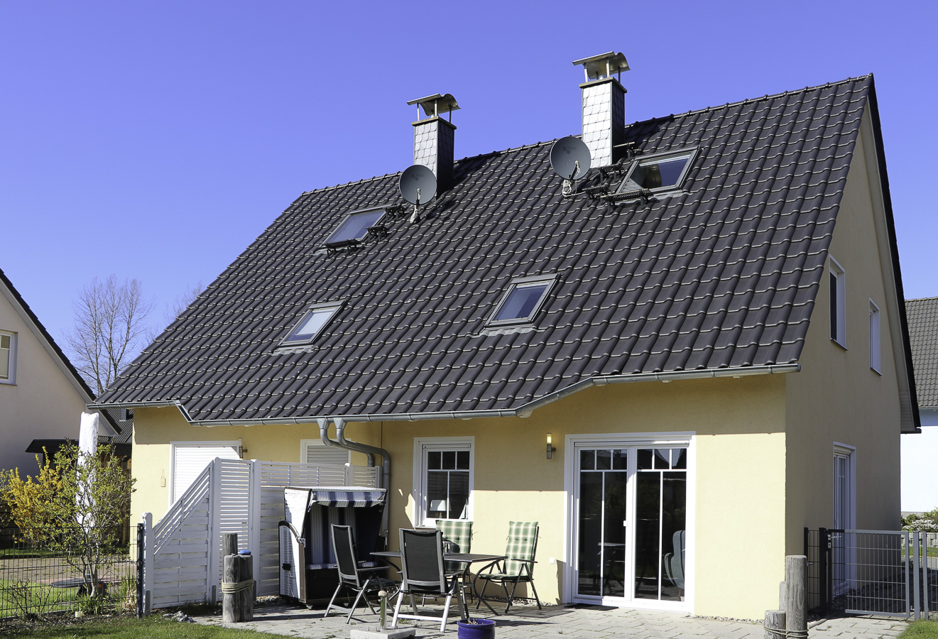 Hier finden Sie Erholung und Entspannung. Im Wohnzimmer erwartet Sie eine gemütliche Sitzecke mit Fernseher und ein Kaminofen sowie der Esstisch mit 6 Stühlen. Die moderne Küche ist offen und hält alles für Sie bereit - einen Geschirrspüler, Backofen, Mikrowelle und vieles mehr. Es gibt ein Duschbad im EG und eins im OG mit Waschmaschine und Fön. Alle 3 Schlafzimmer befinden sich im 1. OG, in einem der Schlafzimmer ist auch ein 2. Fernseher. Kinderreisebett & Hochstuhl stehen zur kostenfreien Nutzung bereit. Der Spitzboden ist als Lesezimmer eingerichtet und von hier haben Sie einen traumhaften Blick in die Weite und die Natur. Das gesamte EG hat Rollläden, ebenso gibt es an den Fenstern Fliegengitter. Im Außenbereich warten der Grill, Sonnenliegen, Strandkorb und Gartenmöbel auf Sie. Ebenfalls steht Ihnen kostenloses WLAN zur Verfügung. Der PKW-Stellpatz für 2 Autos befindet sich direkt auf dem Grundstück.
