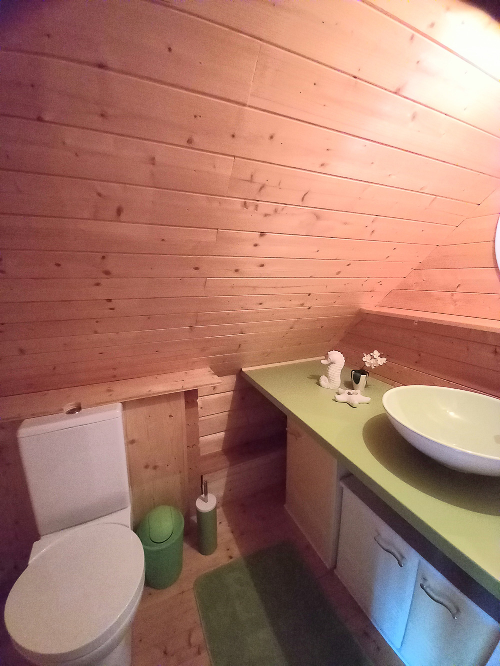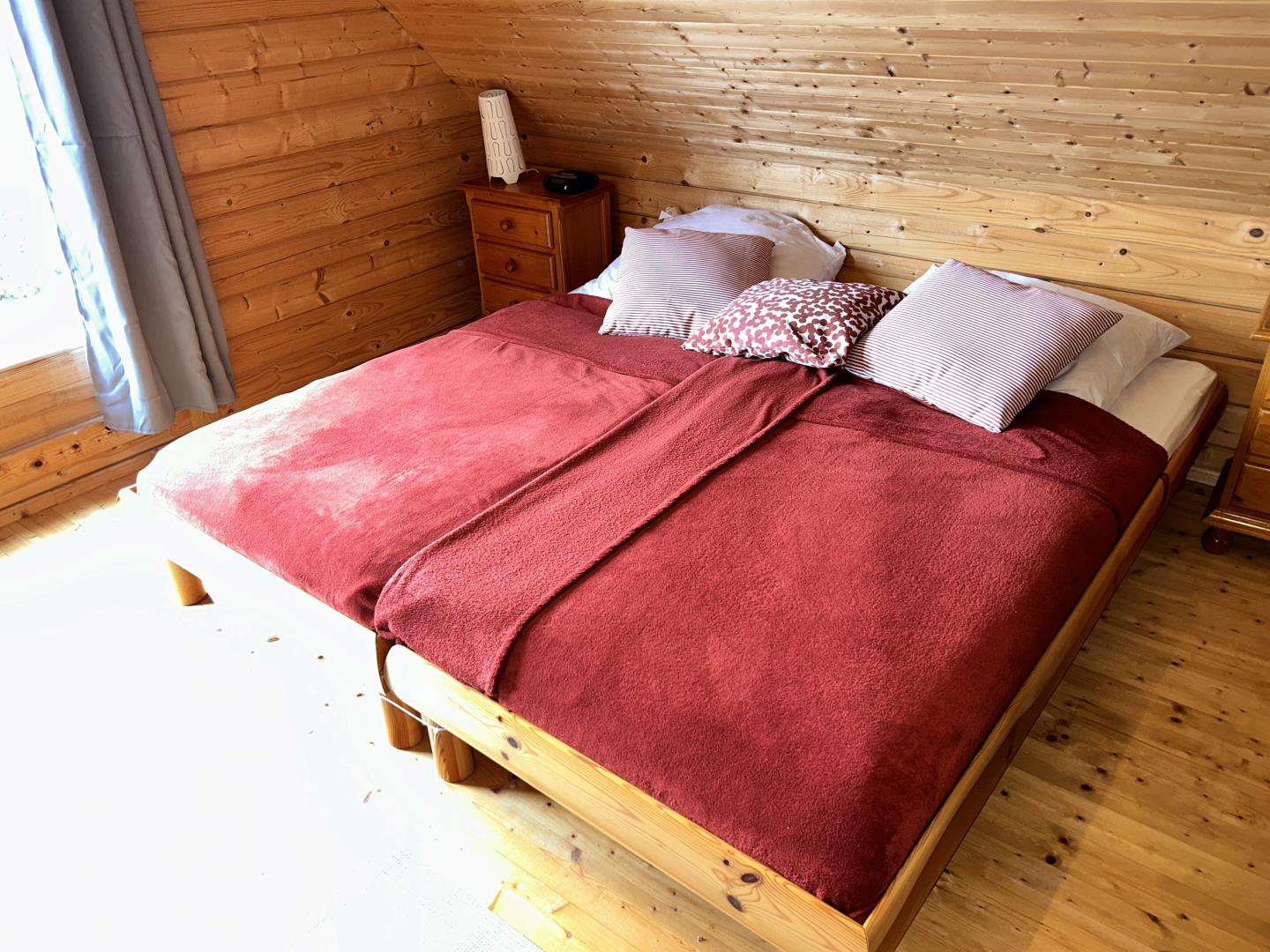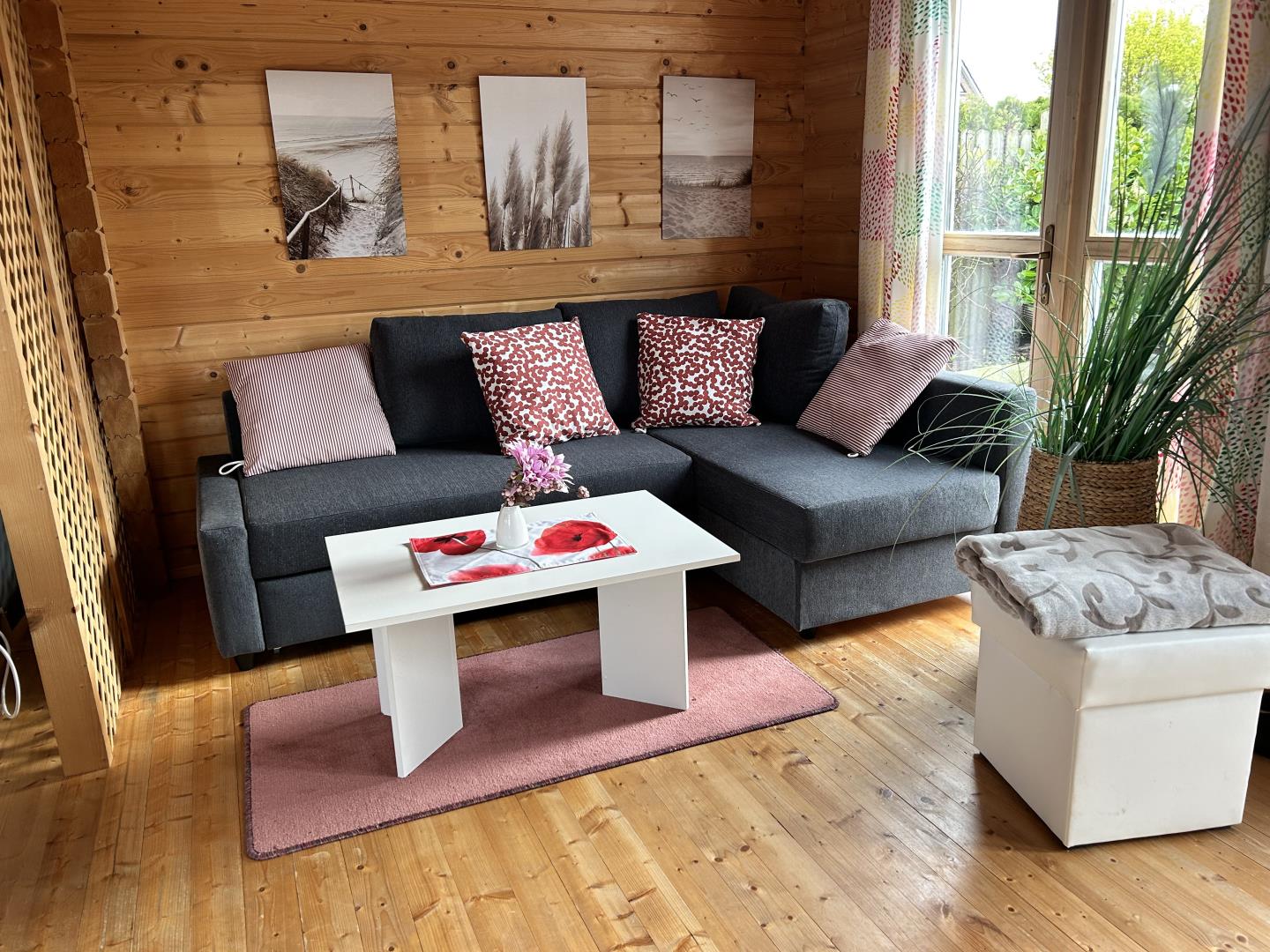 Das Holzhaus mit einer Wohnfläche von ca. 70 m² hat ein Wohnzimmer mit offener Küche. Im Wohnbereich finden Sie TV und Radio sowie einen CD-Spieler. Eine Schlafcouch bietet eine Schlafgelegenheit für 2 Personen. Die Küche ist mit allen modernen Geräten ausgestattet, wie Herd mit Backofen, Kühlschrank mit Gefrierteil, Kaffeemaschine, Toaster, Wasserkocher. Im Wohnzimmer sorgen ein Elektrokamin und ein Infrarotheizkörper für wohlige Wärme in den kühleren Monaten. Das Schlafzimmer im OG ist mit einem Doppelbett (180x200 cm) sowie einem Einzelbett ausgestattet. Das Badezimmer hat eine Dusche. Weiterhin gibt es ein Gäste-WC. Das Haus ist komplett mit Holzdielenfußboden ausgelegt. Ein Holzkinderbettchen und ein Hochstuhl warten auf die kleinsten Gäste. Ein Treppenschutzgitter ist ebenfalls vorhanden.