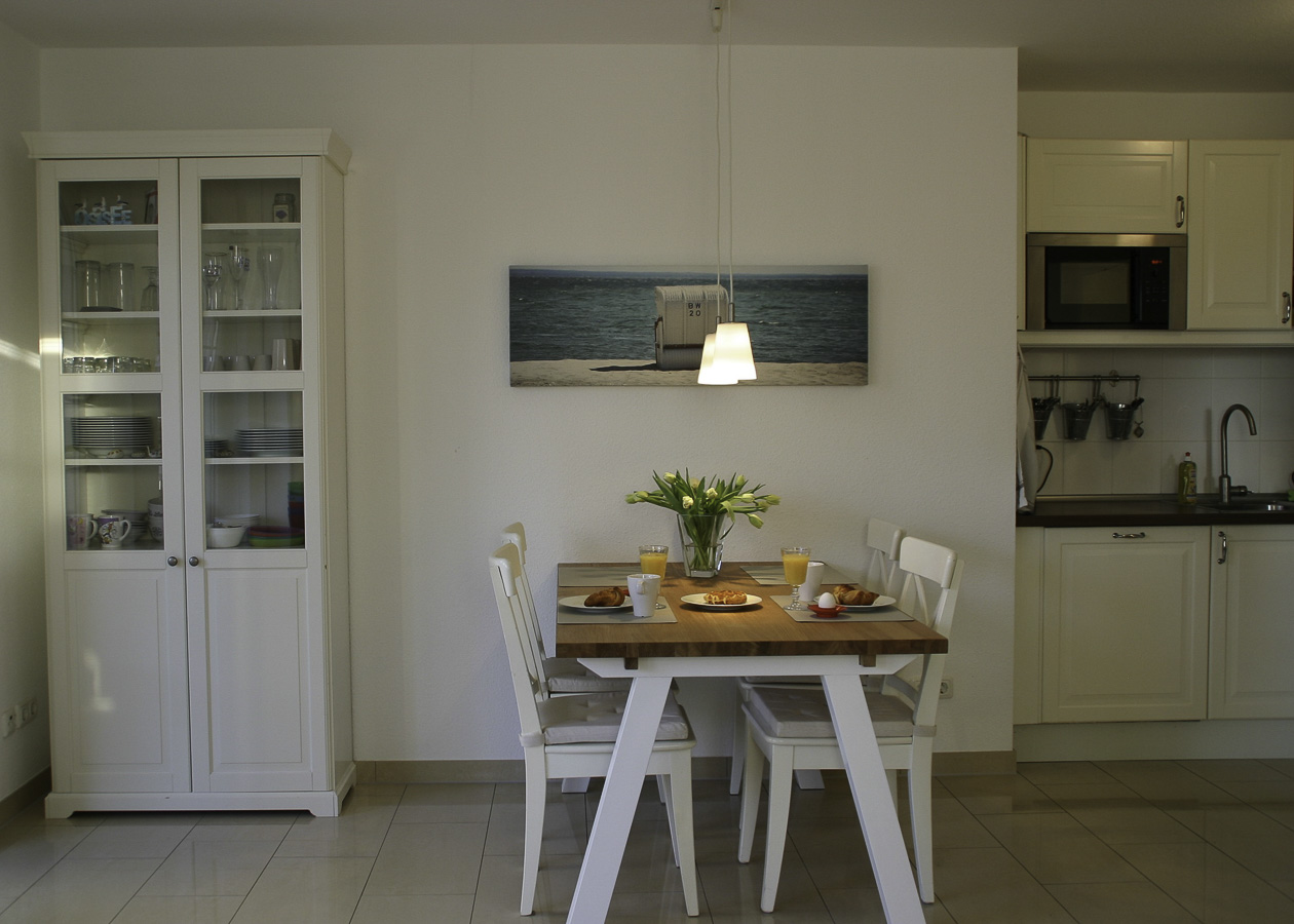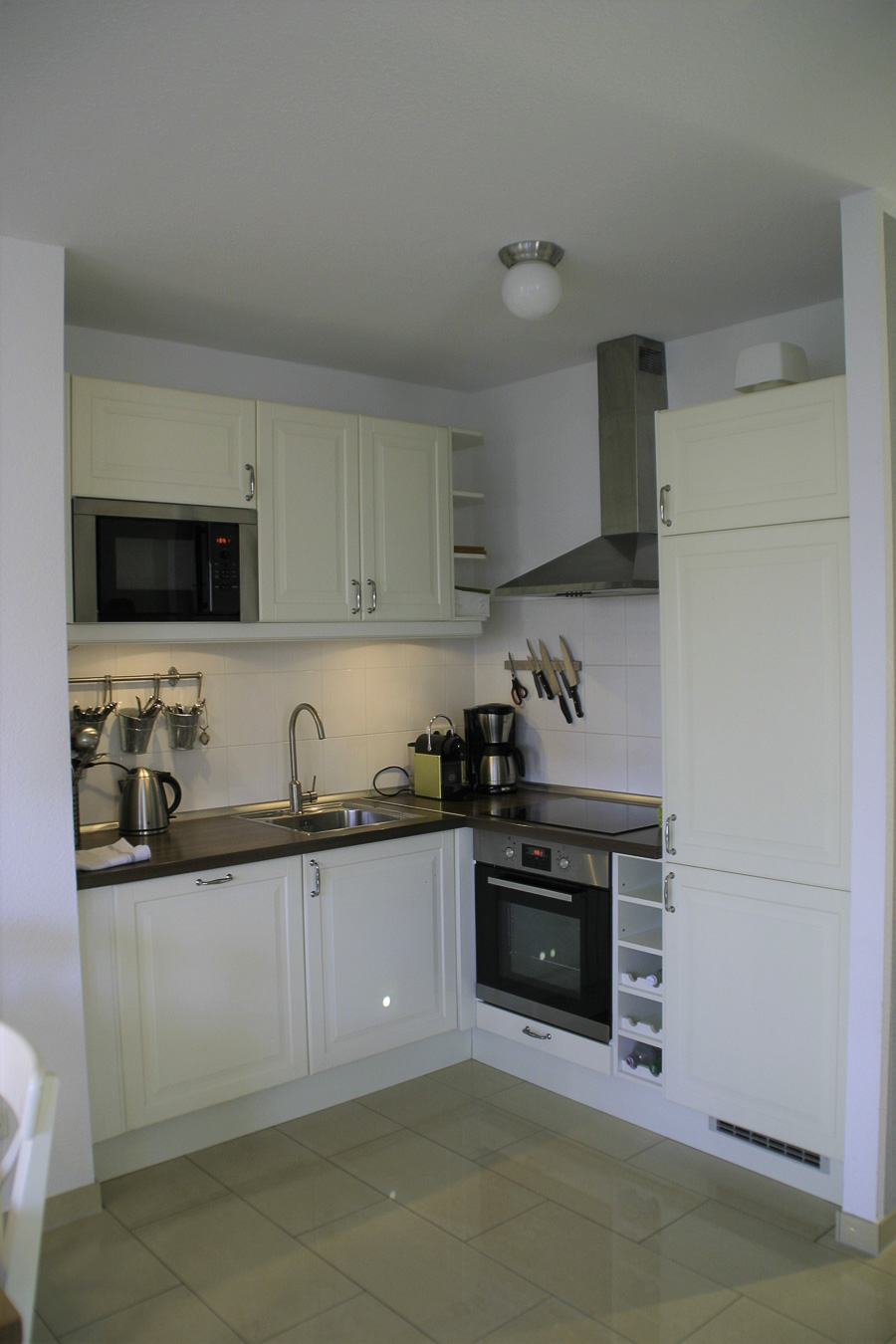 Die hochwertige im Wohnraum integrierte Einbauküche verfügt über einen Herd mit Backofen, einen Kühlschrank mit Gefrierfach, einen Geschirrspüler, eine Mikrowelle, zwei Kaffeemaschinen (Filter & Nespresso), einen Toaster, einen Wasserkocher sowie über ausreichend Geschirr, Töpfe und praktische Küchenhelferlein. Das Duschbad mit Glasduschkabine ist ausgestattet mit einem Handtuchwärmer sowie einer Waschmaschine.
