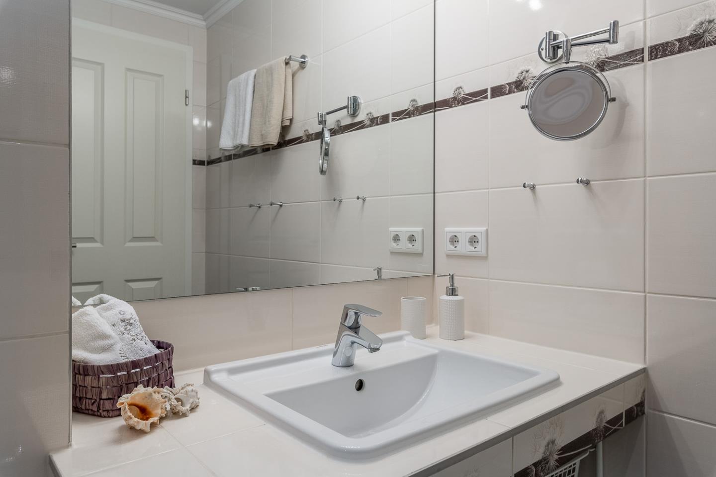 Das elegante Duschbad mit Fußbodenheizung bietet eine ebenerdige Dusche, Handtuchtrockner, Fön und Kosmetikspiegel.