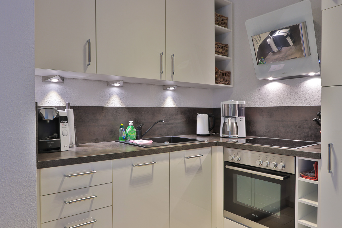 Die hochwertige, offene Einbauküche ist mit Geschirrspüler, Backofen, Cerankochfeld, Kühlschrank mit Gefrierfach, Mikrowelle, Kaffeemaschine, Tassimo Joy Kapselmaschine für die Zubereitung von Heißgetränken, Wasserkocher, Toaster etc. komplett ausgestattet.