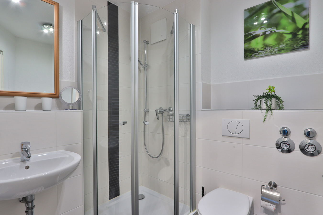 Das Badezimmer bietet eine großzügige Viertelkreisdusche sowie ein kleines Glasregal als Ablage für Ihre persönlichen Utensilien. Ebenfalls vorhanden sind Fön sowie Handtuchheizkörper.