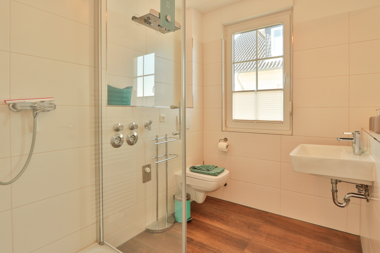 Waschbecken, Fußbodenheizung, Dusche/WC, Föhn, Dusche, Spiegel, WC