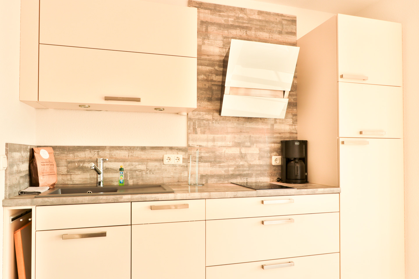 Kaffeemaschine, Ceran-Kochfeld, Geschirrhandtücher, Kochuntensilien, Küche, Kinderhochstuhl, Küche, Toaster, Wasserkocher, Besteck, Waschbecken, Mikrowelle, Herd, Küchenzeile, Kühlschrank, Küchenzeile, Geschirr, Gefrierfach, Geschirrspüler