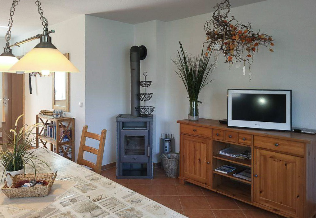 Ein Kamin im Wohnbereich sorgt für behagliche Atmosphäre an kühleren Tagen.