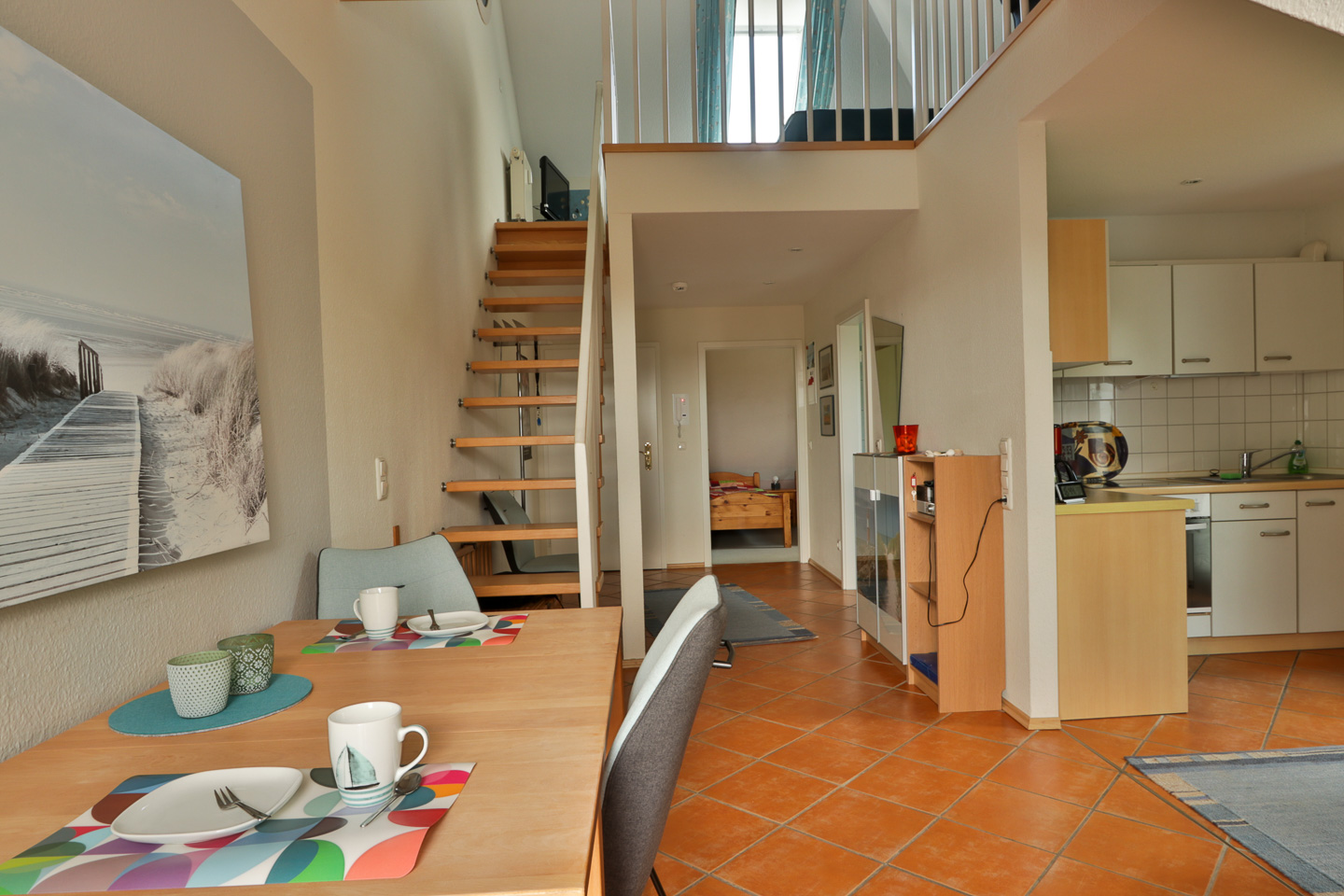 Hier erwartet Sie eine sehr schöne, geräumige und helle Ferienwohnung mit 1 Schlafzimmer mit 2 Einzelbetten, welche sich zu einem Doppelbett zusammenfügen lassen und einem 2. offenen Schlafzimmer in der Galerie mit einem Doppelbett 160 x 200 cm. Das Wohnzimmer hat eine offene Küche mit allen modernen Geräten und einem Esstisch. Das Bad mit Dusche, WC und Waschmaschine fehlt natürlich auch nicht. Auf dem Balkon können Sie schöne Stunden genießen. Direkt am Haus befindet sich der PKW-Stellplatz-Nr. 5.