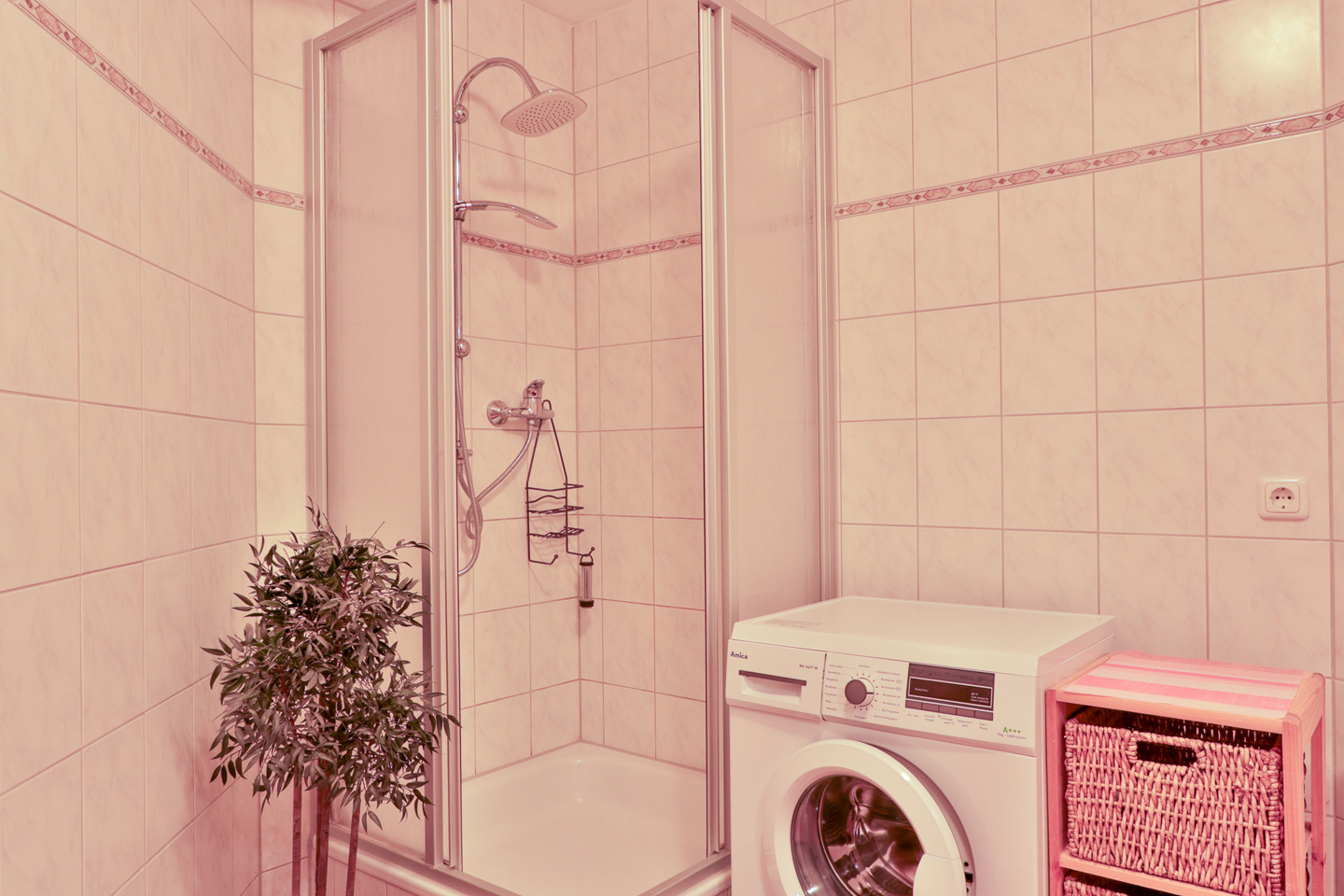 Haartrockner, Dusche/WC, Spiegel, Föhn, WC, Waschbecken, Waschmaschine, Dusche