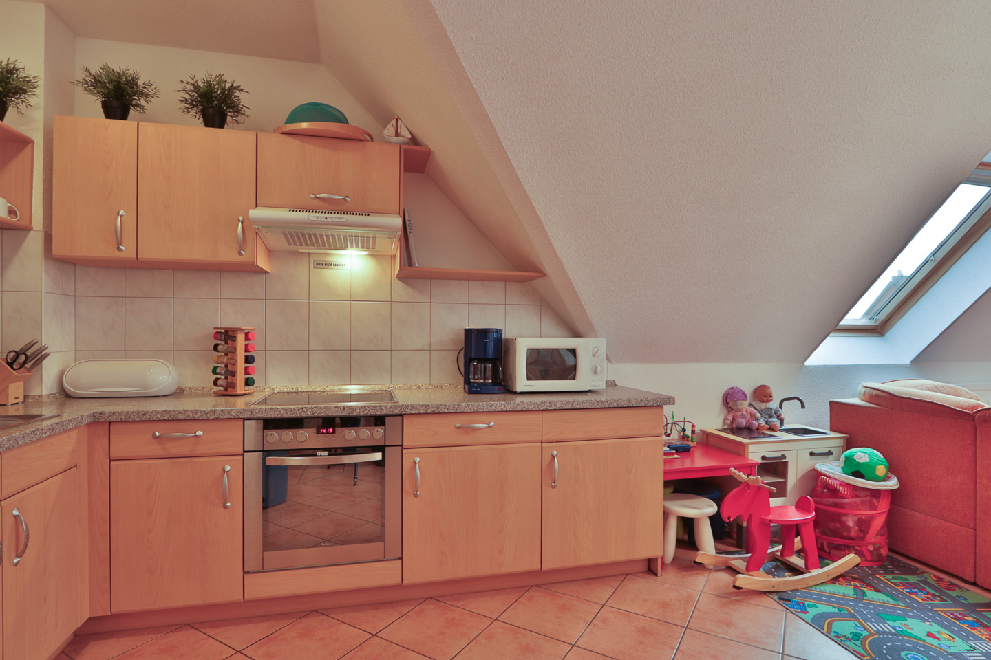 Mikrowelle, Geschirrspüler, Kinderhochstuhl, Geschirr, Küchenzeile, Kühlschrank, Gefrierfach, Kochuntensilien, Geschirrhandtücher, Kühlschrank inkl. Gefrierfach, Spülmaschine, Besteck, Ceran-Kochfeld, Backofen, Herd, Toaster, Küchenzeile voll ausgestattet, Küchenzeile, Waschbecken, Wasserkocher