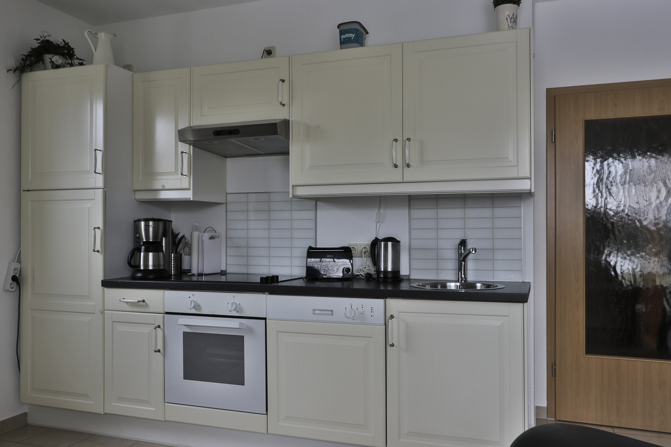 In dem hellen und freundlichen Wohnzimmer gibt es natürlich eine Couch, die auch zum Schlafen für 1 Person geeignet ist, TV und die offene Küche. Diese ist modern und komplett mit allen Dingen des täglichen Bedafs ausgestattet und der Esstisch mit 4 Stühlen ist ebenfalls vorhanden.