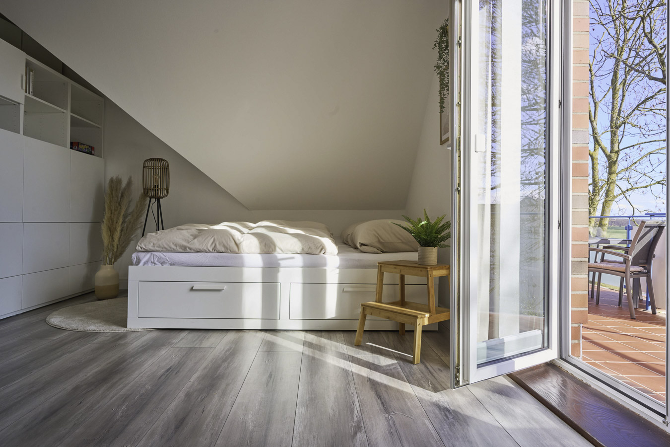 Im Badeort Börgerende zwischen Warnemünde und Kühlungsborn begrüßt Sie die romantische Ferienwohnung "Strand in Sicht". Eine 20 qm Dachterrasse bietet Ihnen einen atemberaubenden Blick über die Felder, aus der Ferne winkt das Meer. Die moderne und liebevoll eingerichtete Ferienwohnung ist unterteilt in ein Schlafzimmer mit Doppelbett und Schreibtisch fürs Homeoffice, einen großen Wohnraum, sowie ein Badezimmer mit Dusche und WC. Der Wohnbereich bietet neben der offenen Küche mit großem Essbereich, eine gemütliche Sofaecke sowie ein zusätzliches ausziehbares Doppelbett für zwei weitere Personen.