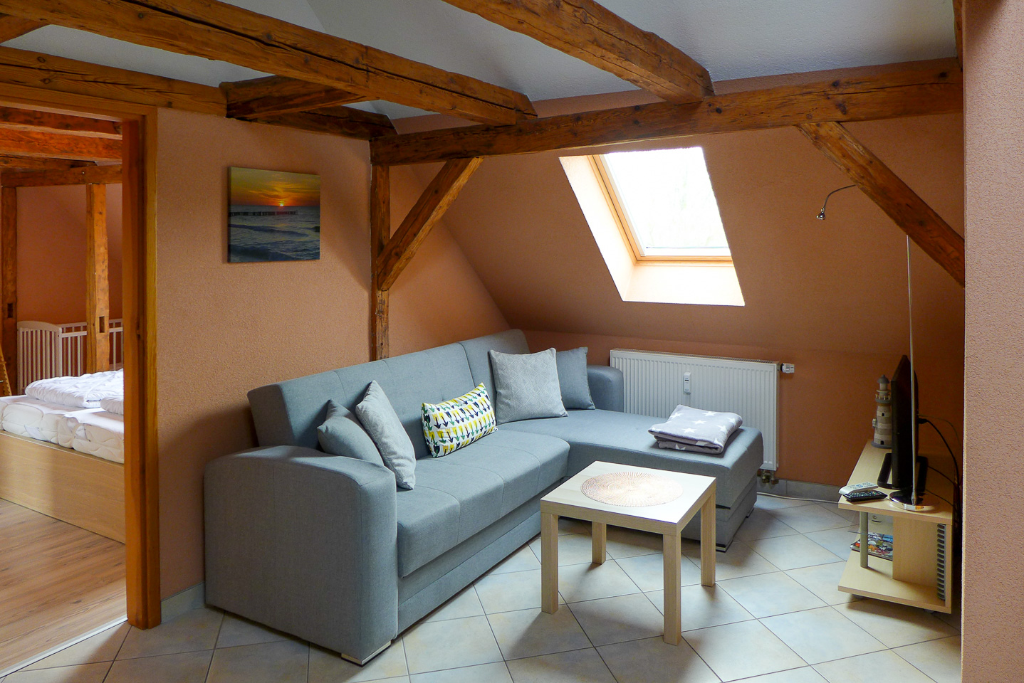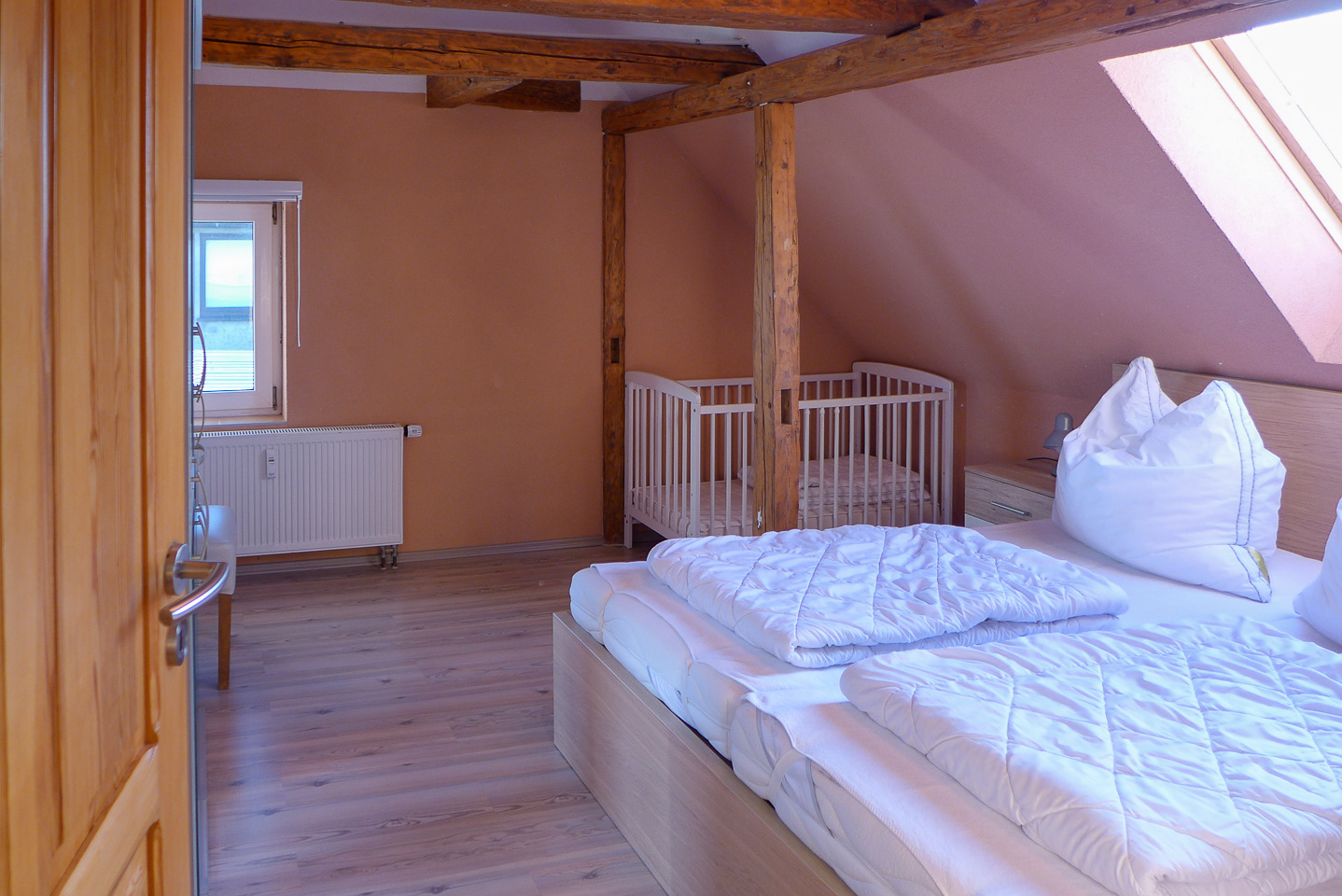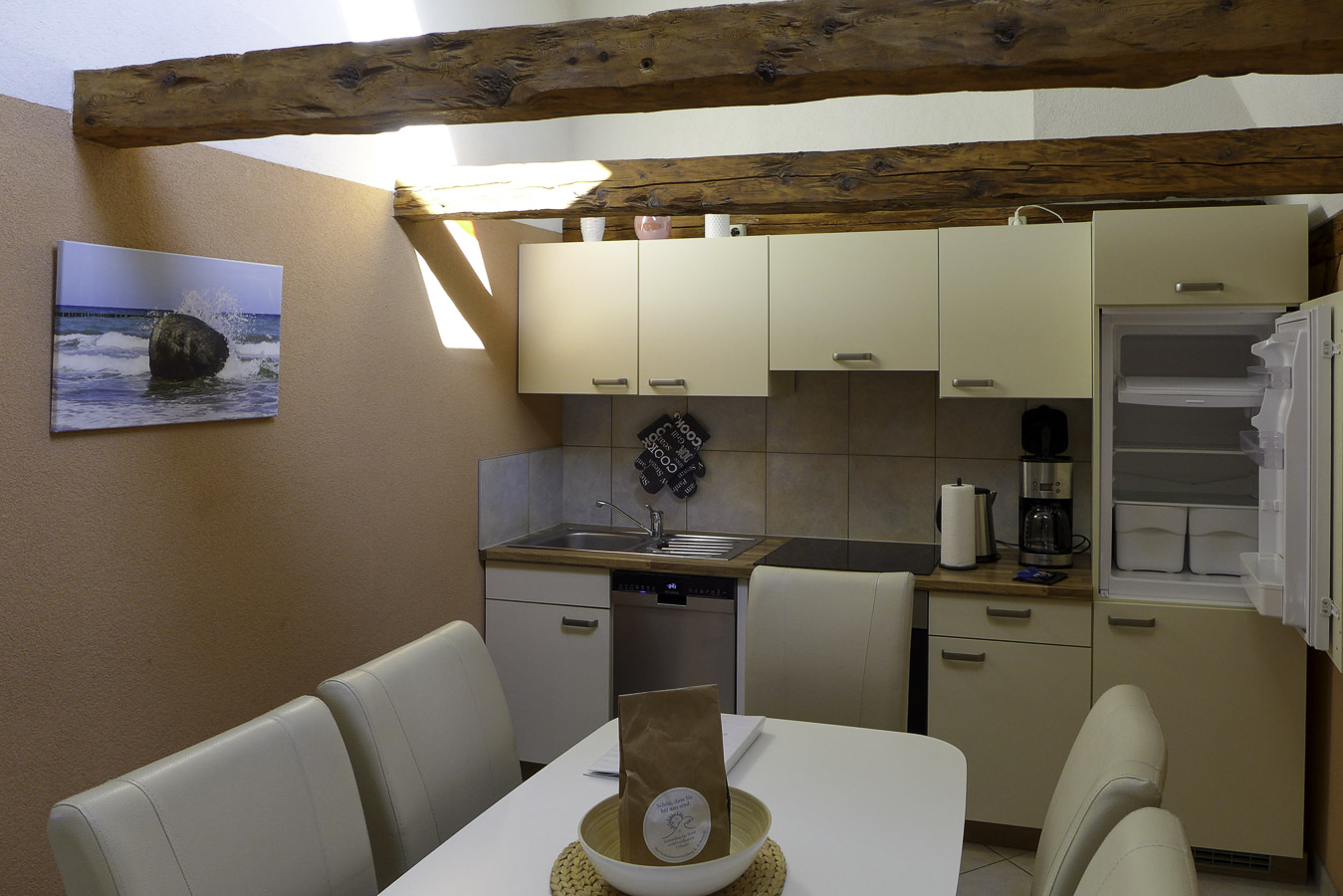 Die gemütliche Ferienwohnung mit Fachwerk verfügt über 1 Schlafzimmer mit Doppelbett (180 x 200 cm) und mit einem festen Kinderbett sowie einem Verdunklungsrollo. Im zweiten Schlafzimmer gibt es 2 Einzelbetten mit je 90 x 200 cm. Das Wohnzimmer hat eine bequeme Couch. Natürlich gibt es hier einen Fernseher, Radio . Die Küche ist modern ausgestattet mit Geschirrspüler und offen im Wohnbereich. Im hellen Duschbad steht eine Waschmaschine für Ihre kleine Wäsche bereit. Ein Parkplatz steht vor dem Haus zur Verfügung.