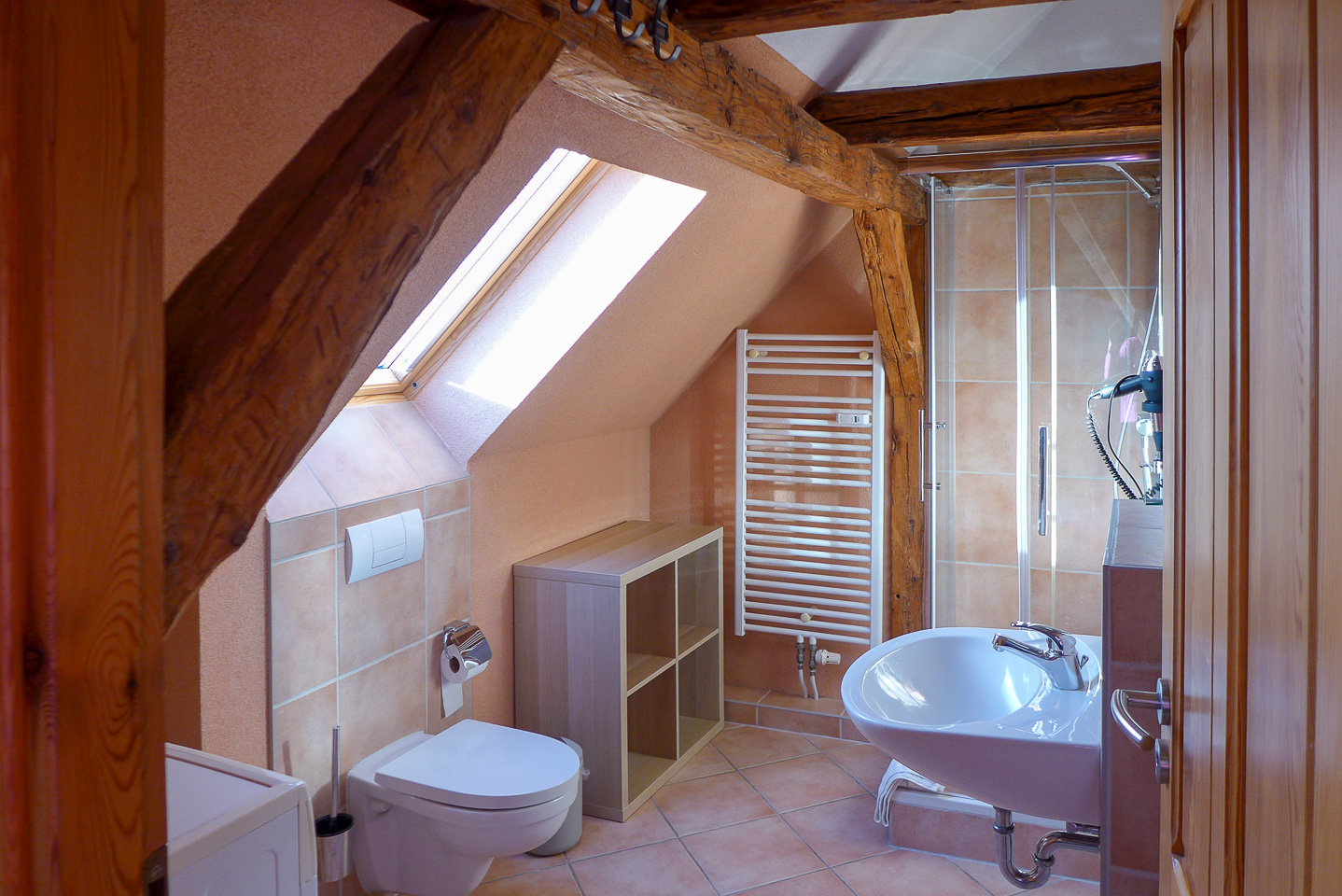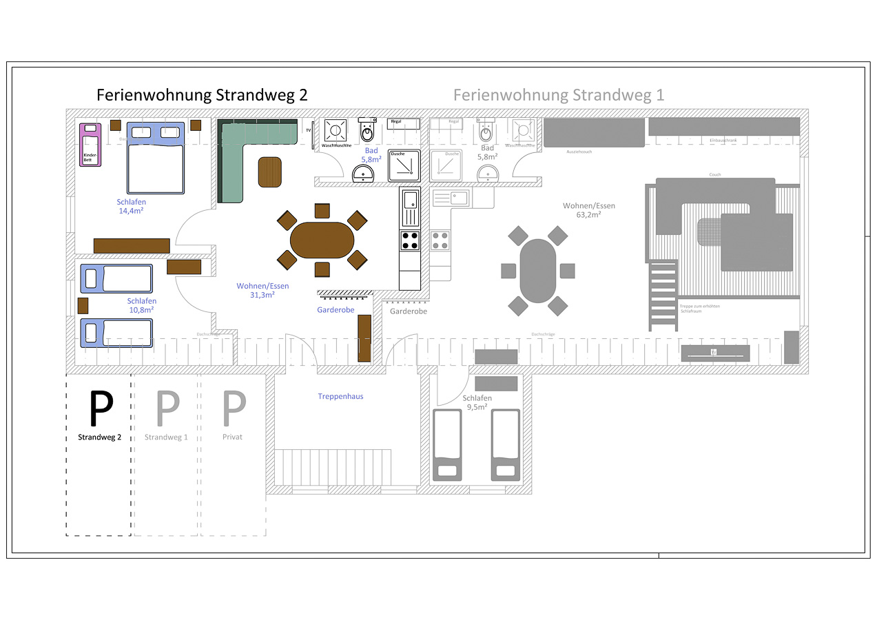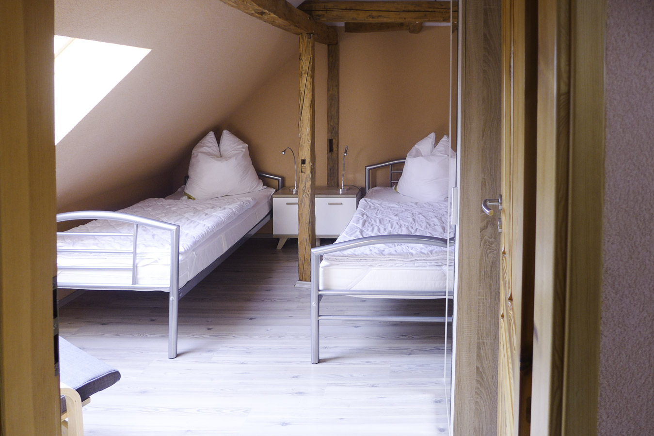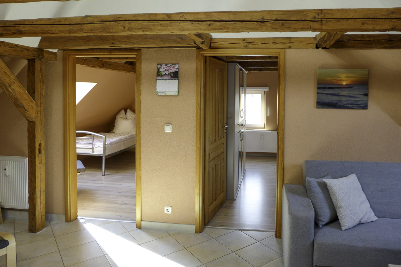 Die gemütliche Ferienwohnung mit Fachwerk verfügt über 1 Schlafzimmer mit Doppelbett (180 x 200 cm) und mit einem festen Kinderbett sowie einem Verdunklungsrollo. Im zweiten Schlafzimmer gibt es 2 Einzelbetten mit je 90 x 200 cm. Das Wohnzimmer hat eine bequeme Couch. Natürlich gibt es hier einen Fernseher, Radio . Die Küche ist modern ausgestattet mit Geschirrspüler und offen im Wohnbereich. Im hellen Duschbad steht eine Waschmaschine für Ihre kleine Wäsche bereit. Ein Parkplatz steht vor dem Haus zur Verfügung.