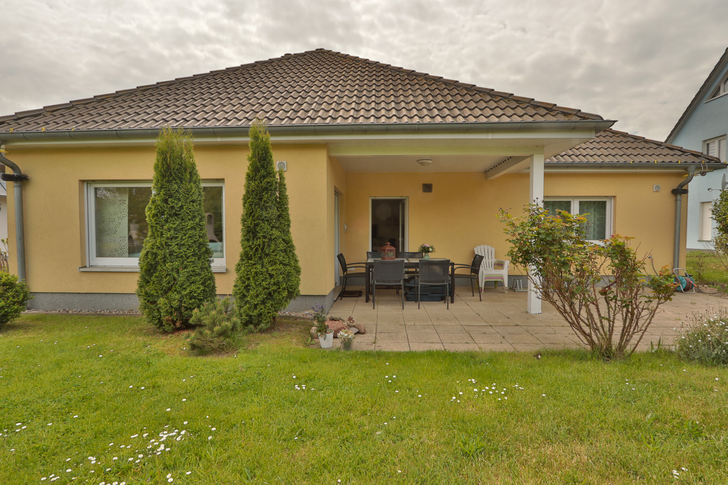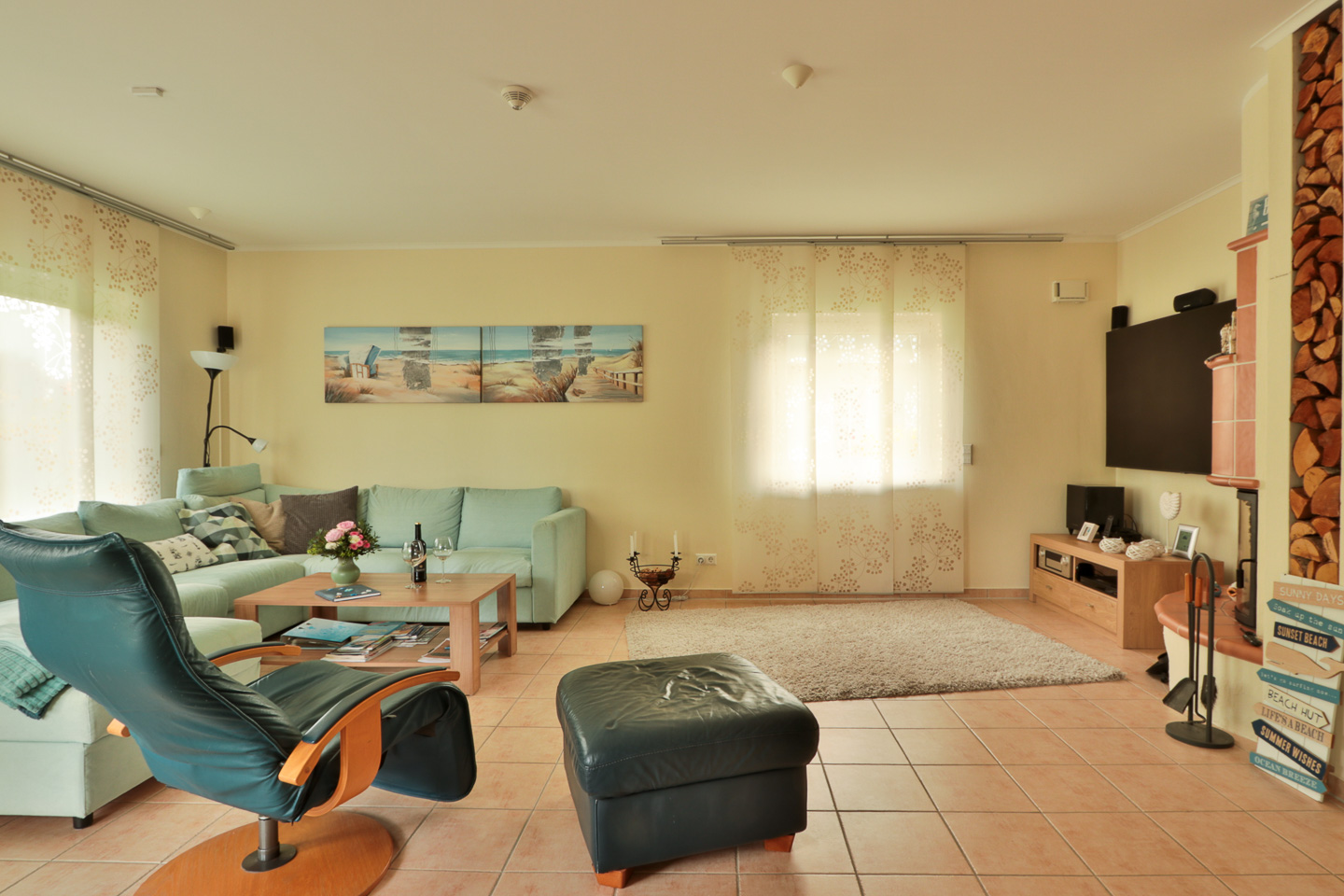 Im geschmackvoll und liebevoll eingerichteten Ferienhaus "Lazy Days" finden Sie ein großzügiges Wohnzimmer mit Kamin. Der gemütliche Wohnbereich verfügt über eine Couch mit Blick zum großen TV sowie ein Esstisch ebenfalls mit TV. Die angrenzende offene Küche ist komplett mit allen modernen Geräten ausgestattet und lässt keine Wünsche offen. In einem der 3 Schlafzimmern steht ein Doppelbett zur Verfügung sowie Kleiderschrank. In den beiden anderen Schlafzimmer gibt es jeweils 2 Einzelbetten und in einem Schlafzimmer steht noch ein TV zur Verfügung. Außerdem sind 2 Bäder vorhanden, eins mit Wanne und das andere mit bodengleicher Dusche. Die Terrasse ist teilweise überdacht. Direkt auf dem Grundstück stehen 3 PKW-Stellplätze zur Verfügung.