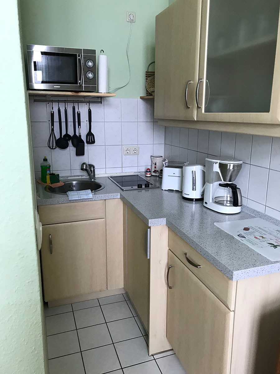 Besteck, Mikrowelle, Küchenzeile, Küchenzeile, Ceran-Kochfeld, Wasserkocher, Kochuntensilien