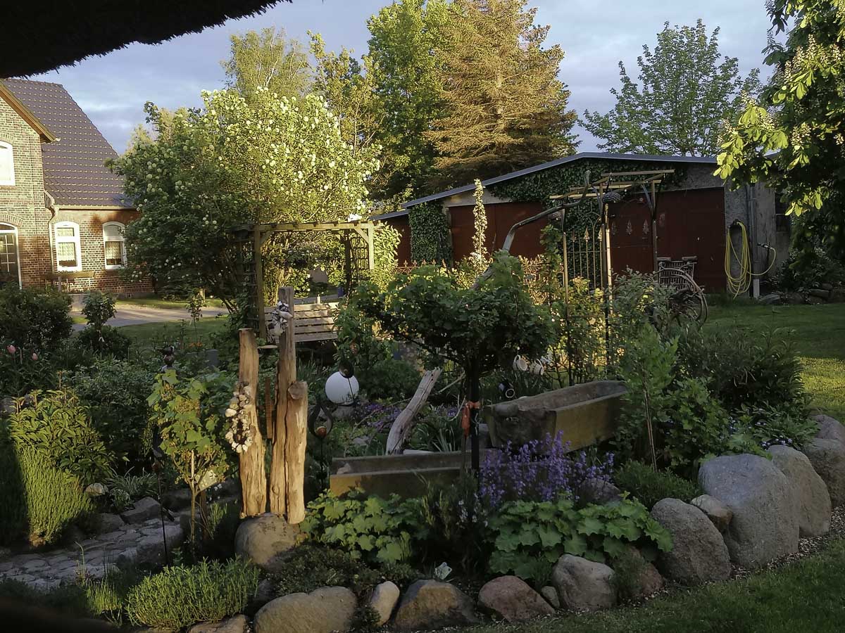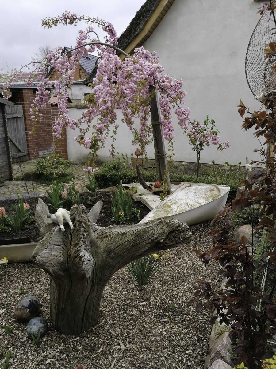 Herzlich Willkommen im Reetdachhaus am Haff. Unser liebevoll gestalteter Garten lädt zur Erkundungstour ein: Entdecke Skulpturen, kleine feine Töpferkunst und jede Menge Bilder, natürlich selbst gemalt, schnuppere an Blüten und Kräutern oder schau gemeinsam mit uns bei den Tieren auf dem Hof vorbei.