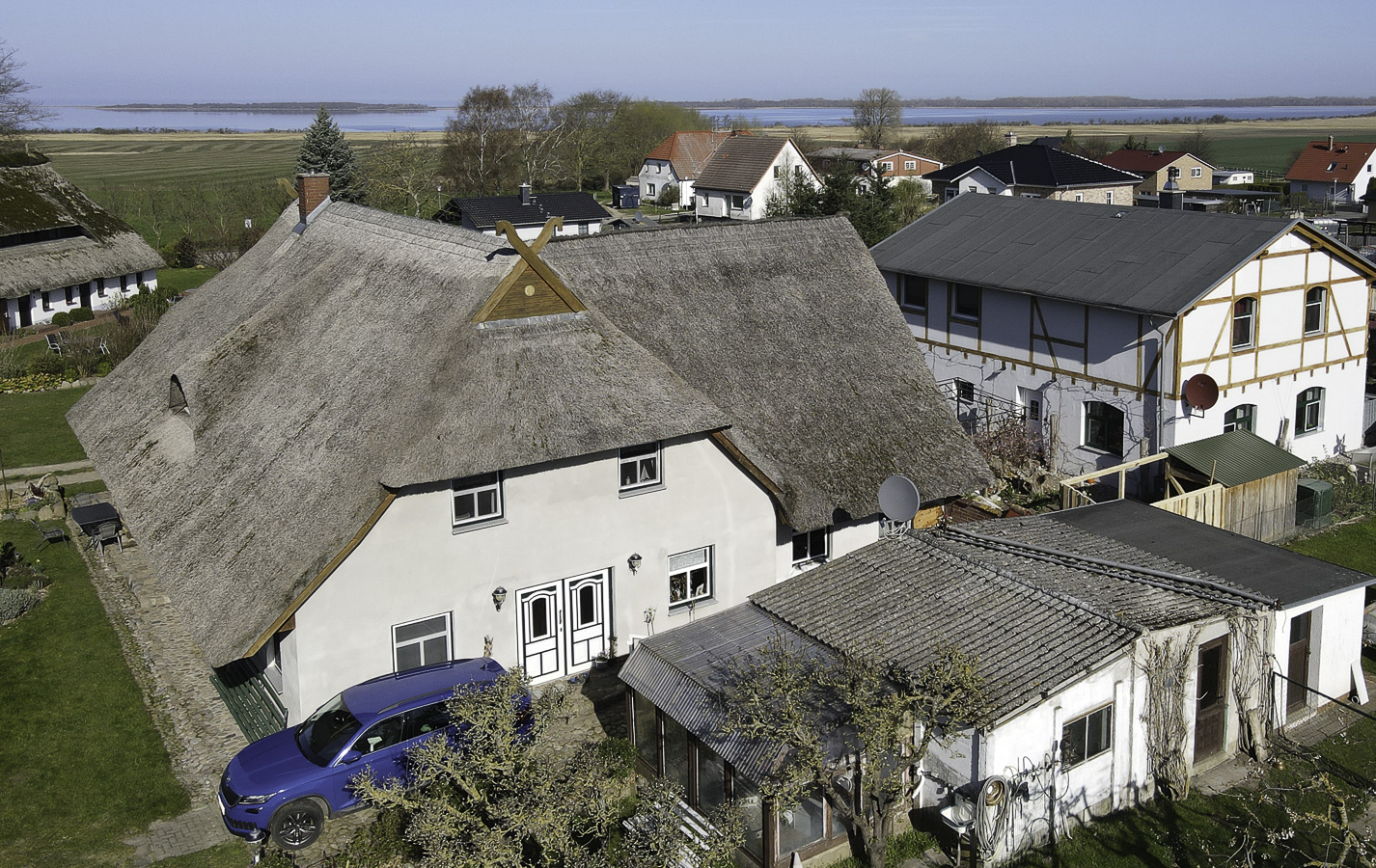 Die kleine, aber feine Anlage ist ideal geeignet für Familienfeste, denn wir können Euch einen sehr schönen Aufenthaltsraum anbieten für bis zu 12 Personen .Ausgestattet ist dieser mit Küche/Geschirrspüler und Kamin. Vor dem Haus befindet sich eine Wiese mit Gartenmöbeln. Das Grundstück bietet viel Möglichkeit zur Freizeitgestaltung. Bis zum Salzhaff sind es nur 10 Minuten zu Fuss. Fans des Wassersports können hier Surfen, Kiten und auf dem Standup dem Sonnenuntergang entgegenpaddeln und für die kleinen Kinder ist der Badestrand traumhaft, da das Wasser sehr flach ist. Unser Mehrgenerationenhof hat einen Hofladen mit Verkauf von saisonalem Obst aus dem Garten, Wurstwaren und Grillfleisch von den eigenen Rindern und Schweinen.