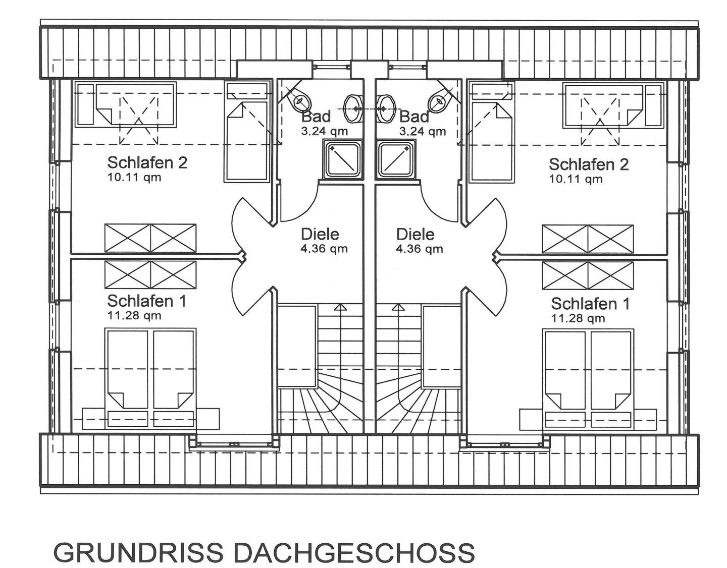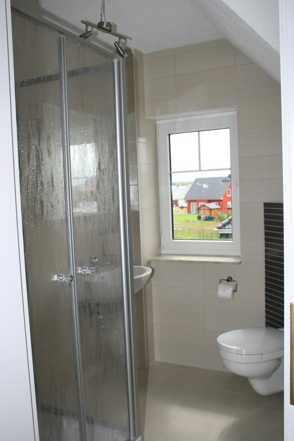 Zwei Schlafzimmer mit komfortablen Doppelbetten und je einem Einzelbett befinden sich im Obergeschoss sowie ein Duschbad, ein weiteres Duschbad mit Waschmaschine gibt es im Erdgeschoss. In den Schlafräumen befinden sich zusätzliche Fernseher.