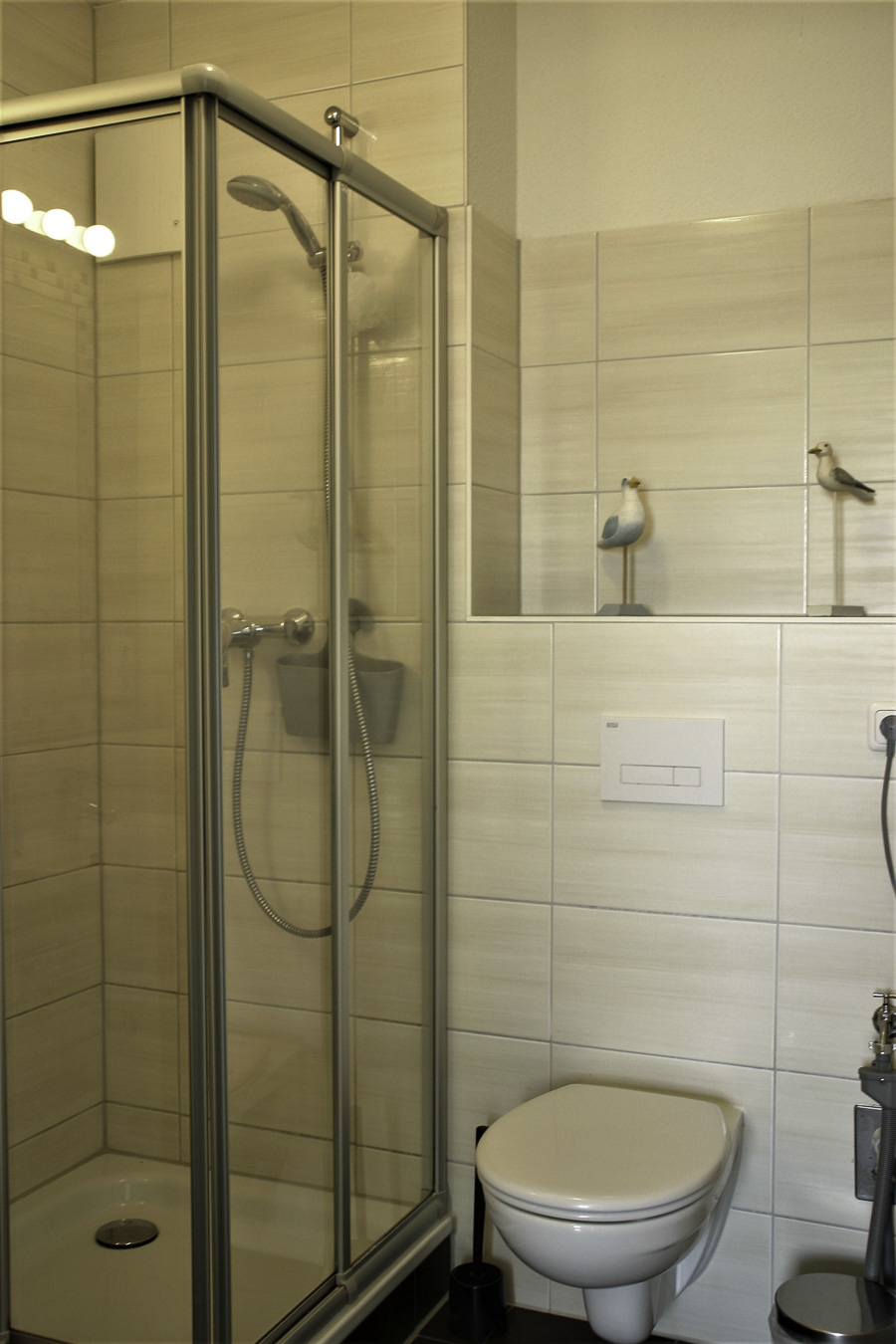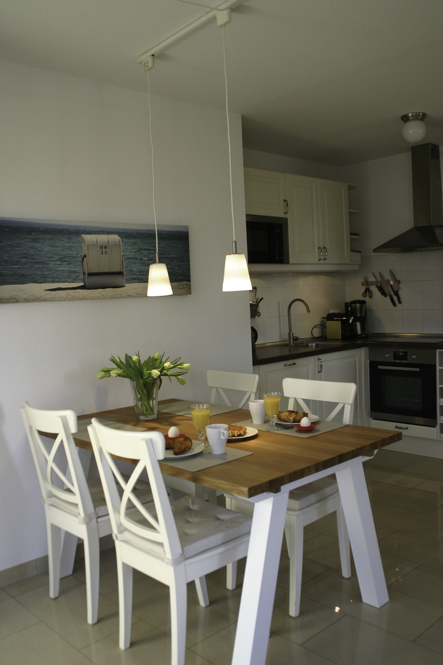 Die hochwertige im Wohnraum integrierte Einbauküche verfügt über einen Herd mit Backofen, einen Kühlschrank mit Gefrierfach, einen Geschirrspüler, eine Mikrowelle, zwei Kaffeemaschinen (Filter & Nespresso), einen Toaster, einen Wasserkocher sowie über ausreichend Geschirr, Töpfe und praktische Küchenhelferlein. Das Duschbad mit Glasduschkabine ist ausgestattet mit einem Handtuchwärmer sowie einer Waschmaschine.