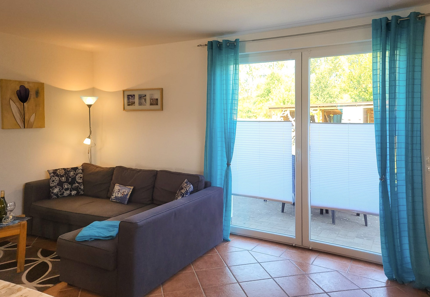 Von hier aus gelangen Sie direkt auf die möblierte Terrasse mit Gartenanteil – perfekt für entspannte Stunden im Freien.