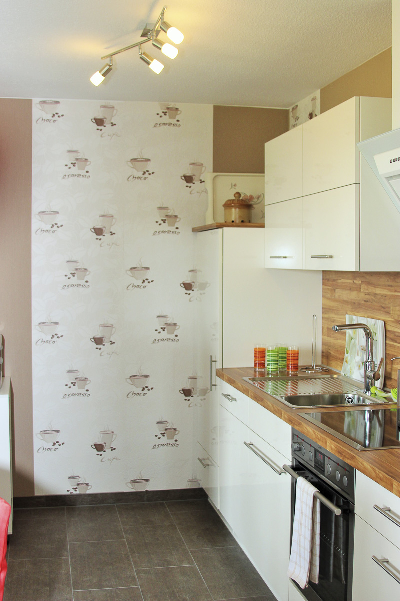 Mikrowelle, Geschirrspüler, Gefrierfach, Kochuntensilien, Küchenzeile, Spülmaschine, Besteck, Ceran-Kochfeld, Backofen, Herd, Küchenzeile, Wasserkocher