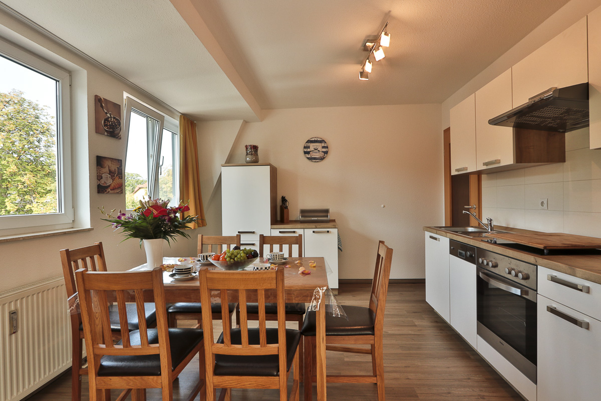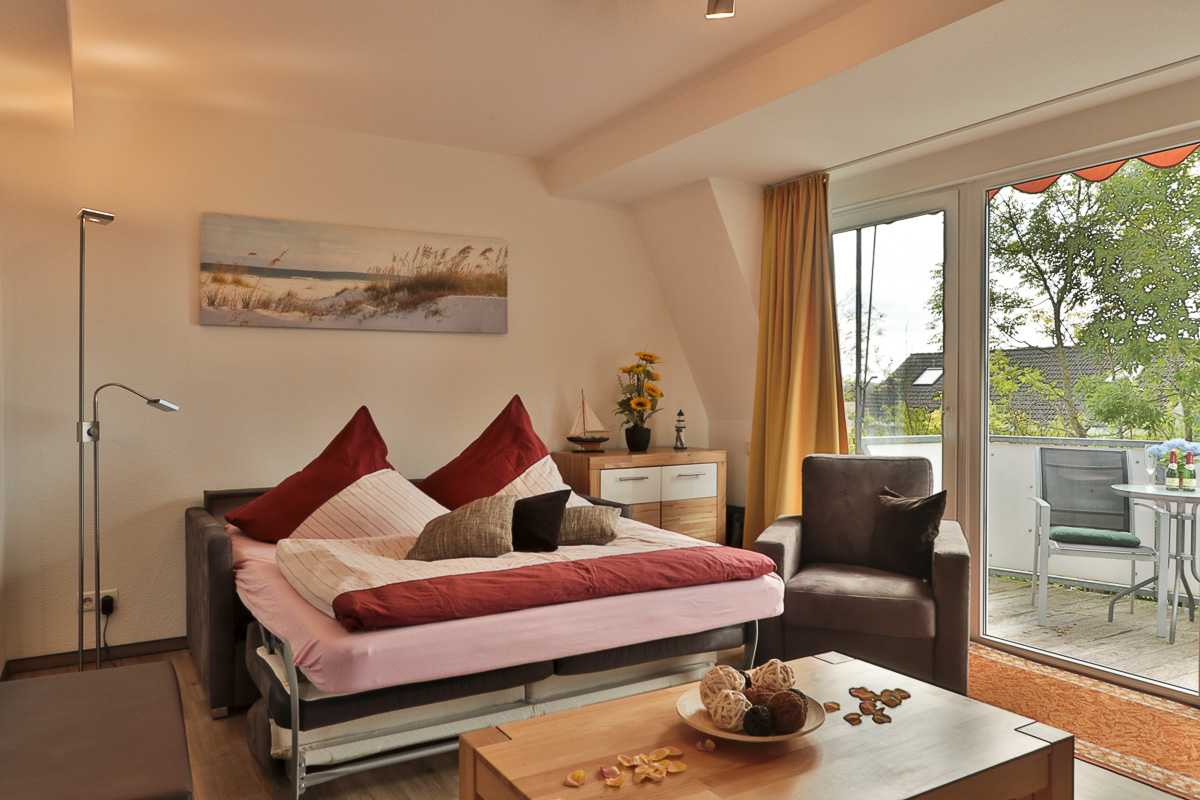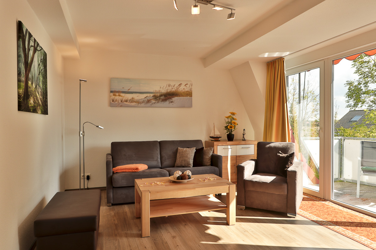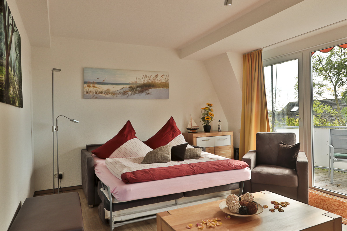 Die moderne Ferienwohnung bietet 4 Personen Platz, da die Couch zu einer sehr guten Schlafgelegenheit umgewandelt werden kann. Auf dem Balkon können Sie die Abenstunden genießen. Ihre vierbeinigen kleinen Lieblinge sind gern gesehene Gäste.