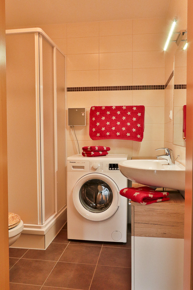 Eine voll ausgestattete Küchenzeile und eine Münzwaschmaschine runden die komfortable Ausstattung dieser Wohnung ab.