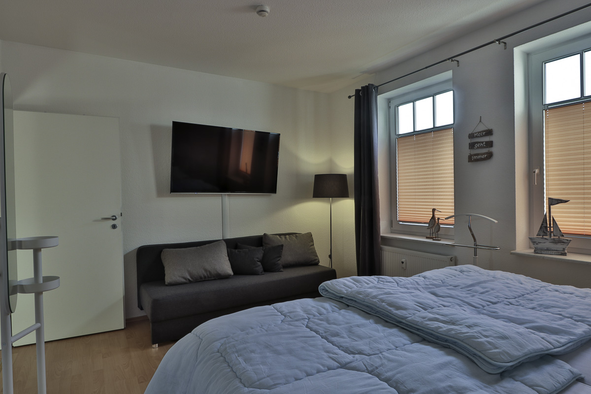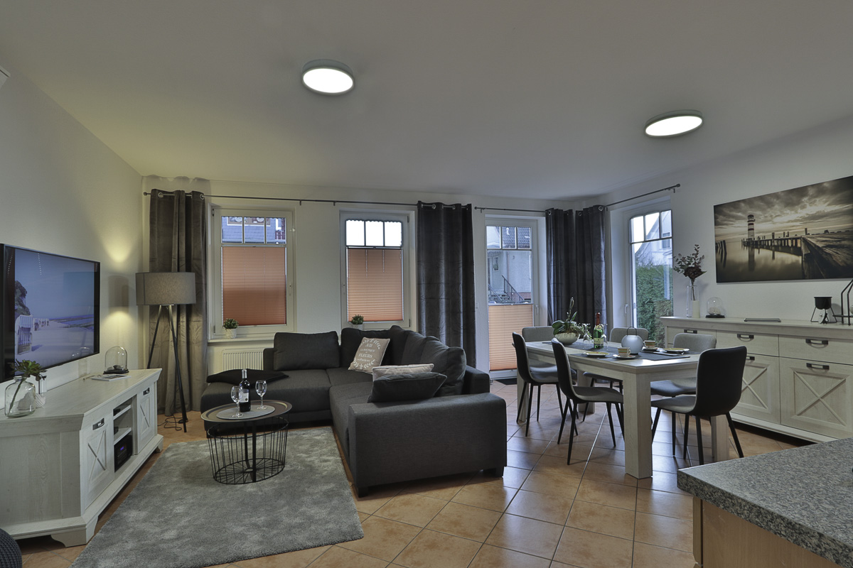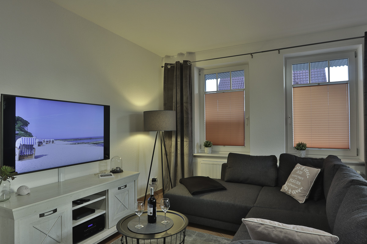 Die modern, renovierte,maritim eingerichtete großzügige Wohnräume sind geeignet für 4 Personen. Die Wohnung ist ruhig gelegen, mit eigener Terrasse und kleiner Rasenfläche. Wenn Sie einmal nicht mit dem Auto unterwegs sein möchten, können Sie gern die bereitgestellten Räder nutzen und den Gespensterwald, welcher sich direkt gegenüber des Hauses befindet, erkunden. Im Schlafzimmer besteht die Möglichkeit, 2 Kinder auf der Schlafcouch übernachten zu lassen. Für die Kleinsten steht ein Kinderbett und ein Hochstühlchen bereit. Die moderne Küche ist mit einem Geschirrspüler ausgestattet. Im Wohnzimmer können CD-, DVD-Player, Netflix und das WLAN kostenfrei genutzt werden. Es steht auch dort eine Schlafcouch zur Verfügung. Der Strand ist fußläufig zu erreichen. Eine Vermietung an Gäste mit Hund, muss erst beim Eigentümer angefragt werden.