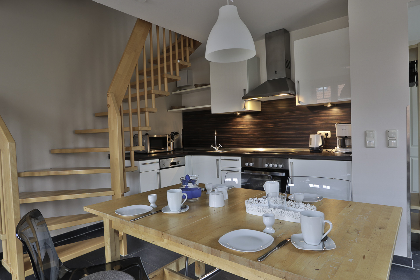 Ein Highlight dieser geräumigen Maisonette-Wohnung ist der eigene Zugang über die Außentreppe. Ihr Urlaubsdomizil verläuft auf einer Gesamtwohnfläche von ca. 60 qm über 2 Ebenen. Zwei separate Schlafzimmer bieten ausreichend Platz für eine vierköpfige Familie. Im unteren Wohnbereich befinden sich die bequeme Couch mit 2 Ledersesseln sowie die moderne Einbauküche, die kaum einen Wunsch offen lässt: Geschirrspülmaschine, Backofen, Mikrowelle und Cerankochfeld sind vorhanden. Hier befindet sich zudem ein charmantes Schlafzimmer für die Kinder mit großem Schrank sowie das Duschbad mit Tageslicht und einer Waschmaschine für die kleine Wäsche.