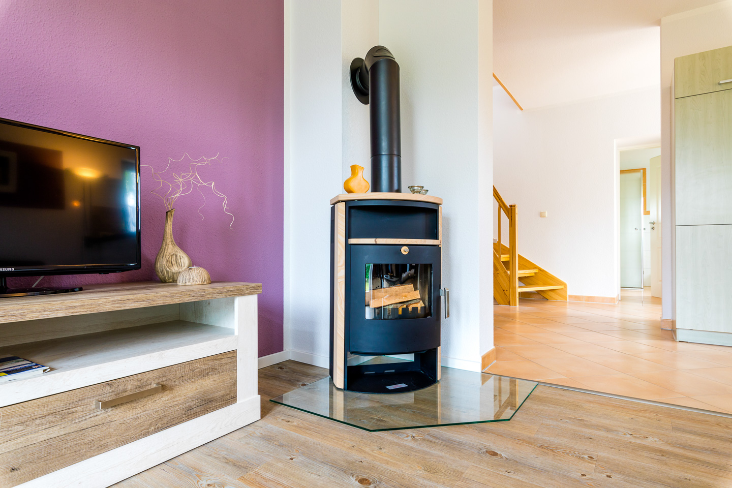 Sofa, Sessel, Kamin, Esstisch, Smart TV